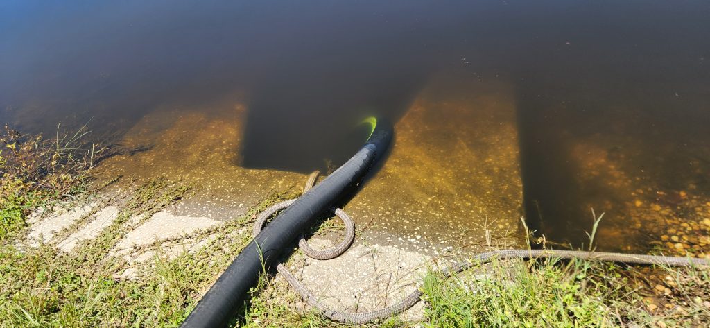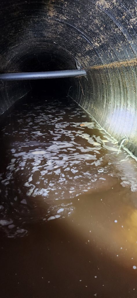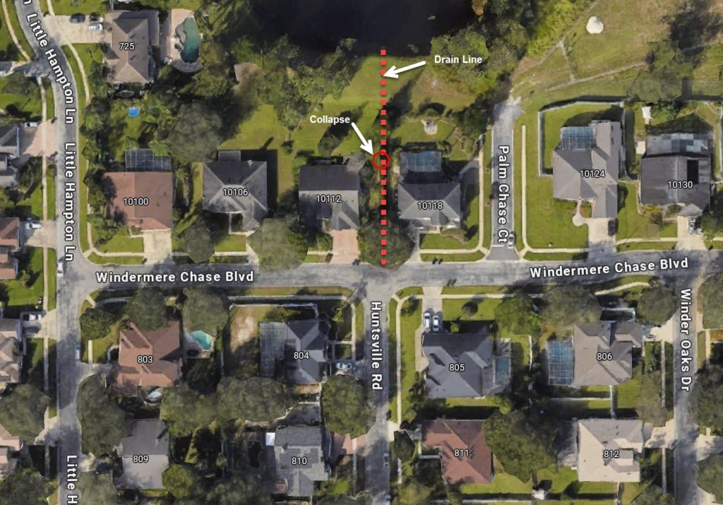 The pipe is currently partially plugged. An industrial pump to handle large rain events is parked on Windermere Chase Blvd. The inspection allowed a visual inspection of the first 94′ of the drain, but we will not know about the rest of the pipe until the collapse is cleared.