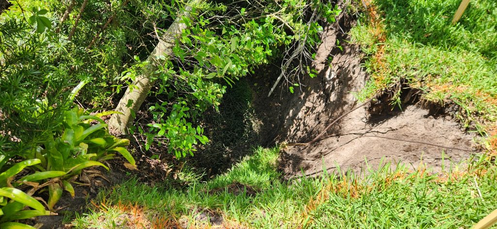 The contractors all agreed that the collapsed pipe had been impaired for many years, and the sand had been washing away for a very long time. Some of the dirt is in the collapsed drain, but a large volume has been washed away. We discovered several dozen other water intrusions in the first 94′ of the drain that continue to pull sand into the drain.