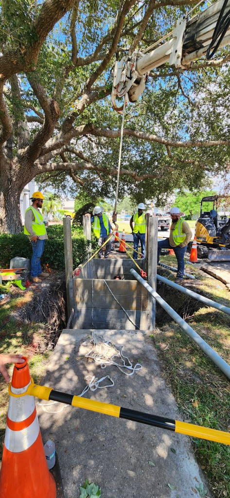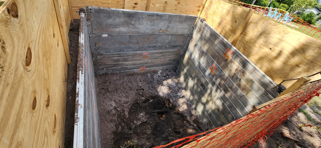 On Thursday July 24th the hole left by the collapse of the pipe was finally secured. This is a major step in this repair process and will be followed by the replacement of a 20′ section of pipe.