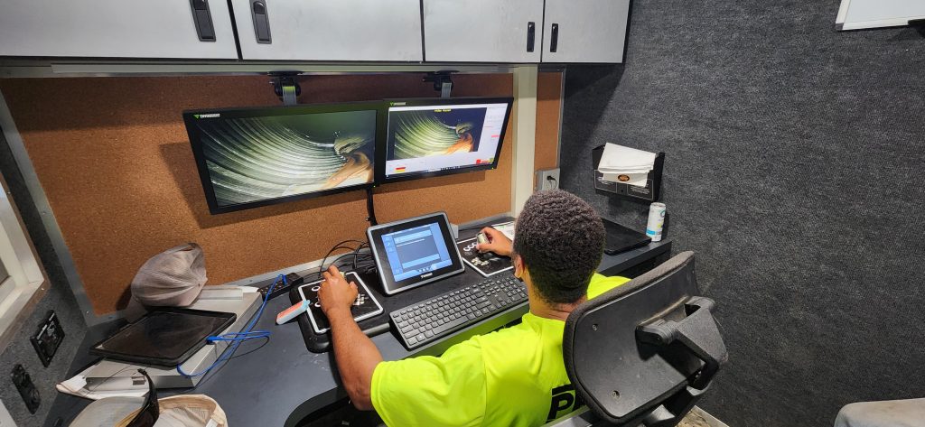 Once the crushed section of the pipe is replaced and the rest of the pipe examined, the next phase of the repair is to install grout to stop the water/sand intrusions and then line the pipe with a sleeve that will provide a new stronger pipe within the old pipe.