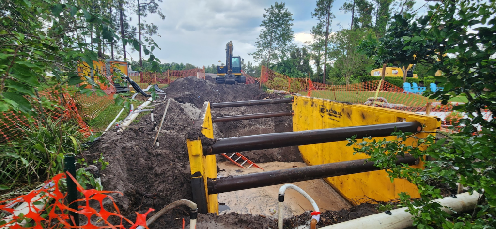 8/20 – The Pipe has been replaced and the hole is filled! The repair of lawns and irrigation should be completed soon.