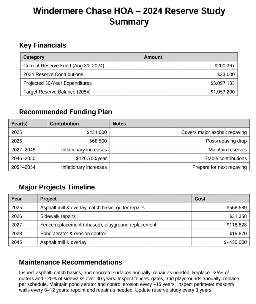 • Increase to $431,000 in 2025 (≈ $309.63/month per owner) to cover repaving.